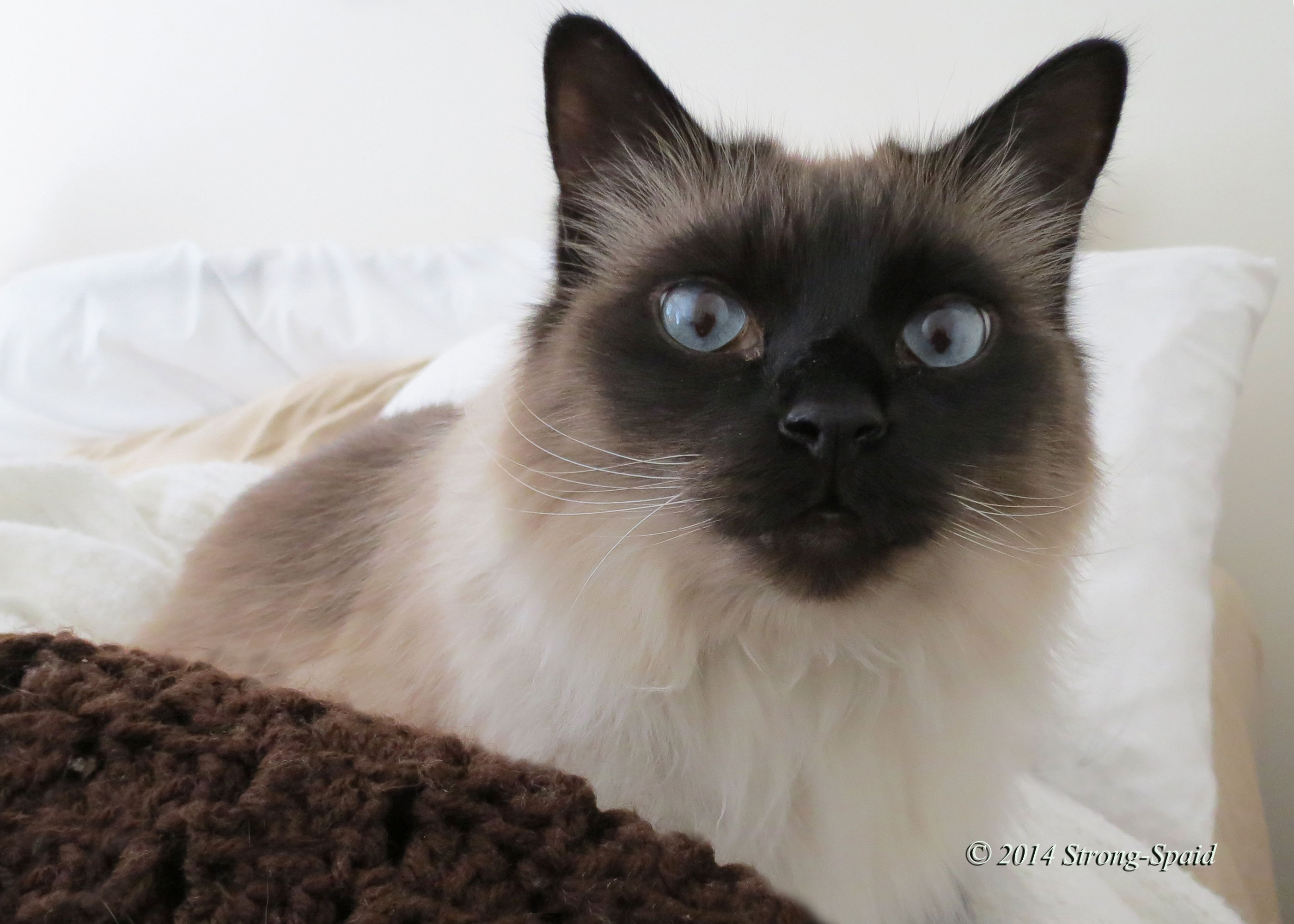 Intense those blue eyes! He (Keona) often does the cat version of the Star Trek “Vulcan Mind Meld.” When he wants something, he will sit down in front of us and stare like this. He thinks that we can hear what he is thinking and IF we don’t understand his wordless mental message correctly…..he gets rather annoyed. Poor baby! Dumb humans. 😉